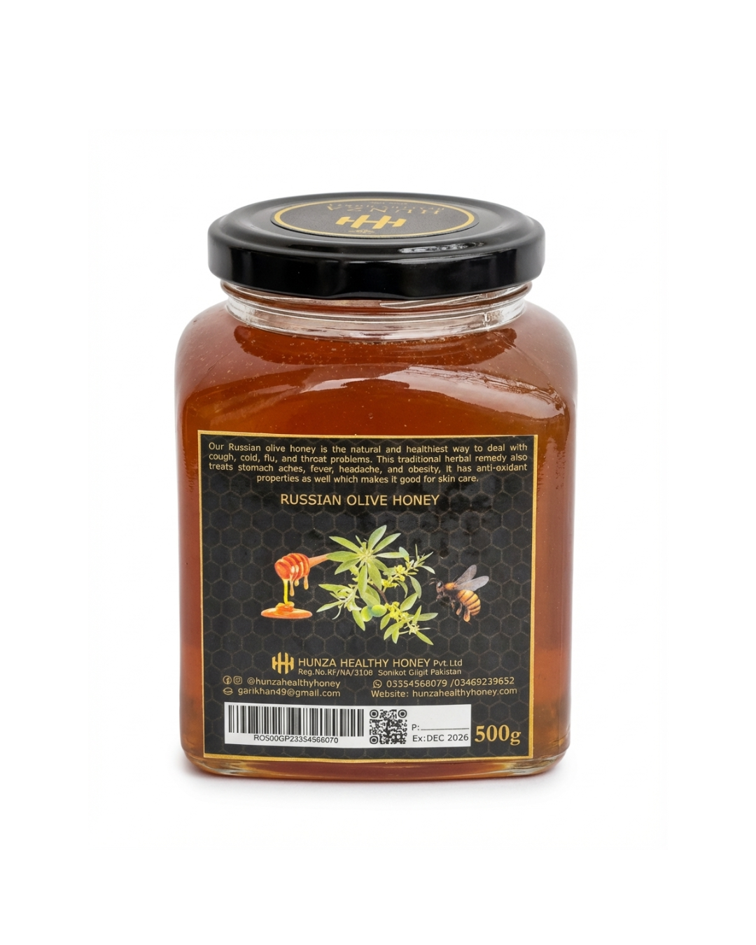 A generous supply of our signature Russian Olive Honey, harvested from the lush blossoms of Russian Olive trees in the pristine valleys of Hunza. Bold in flavor, rich in antioxidants, and free from additives — this is pure mountain honey as nature intended. Perfect for the everyday health-conscious household. The Russian Olive-500g Glass Jar from Hunza Healthy Honey offers a premium experience loved for its unique taste and many health benefits. This honey comes from the nectar of Russian Olive trees, giving it a rich, slightly tangy flavor with subtle floral notes. We harvest this honey in the pristine region of Hunza, ensuring it is 100% pure and organic. Our process avoids any artificial additives or preservatives, so you enjoy only the best from nature.